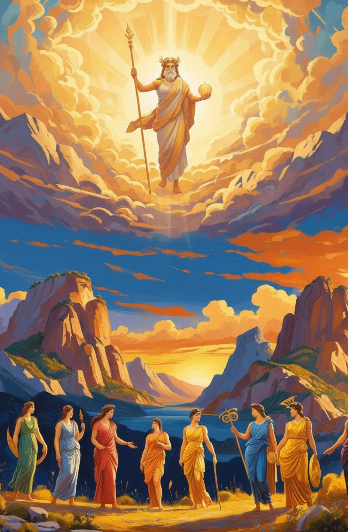 This stunning digital art print captures the divine power of Zeus, king of the gods, ascending through golden clouds above the assembled Olympian deities. The warm, radiant palette of golds, oranges, and blues creates an atmosphere of celestial grandeur perfect for mythology enthusiasts and art lovers alike.